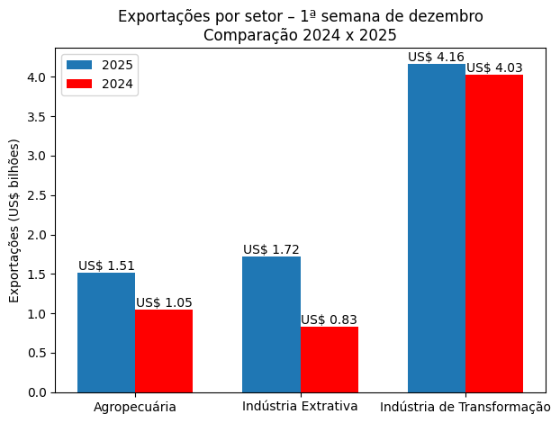- Agropecuária: as exportações passaram de US$ 1,05 bilhão em 2024 para US$ 1,51 bilhão em 2025.